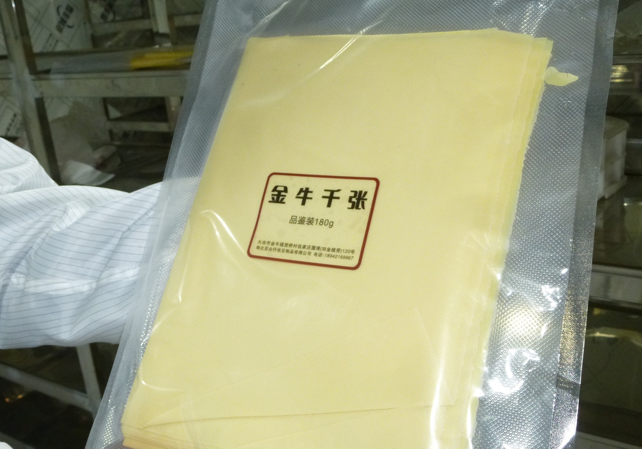 隨后,記者來到公司產品包裝區,烘干后的千張產品整齊碼放,千張塊、千張絲、千張結、菊花千張等多種形態各異、色澤誘人的成品,正被工人細心地裝入包裝箱,即將發往全國各地。詹巍拿起一袋千張結展示:“你看這金燦燦的,多誘人!我們用的是東北優質非轉基因大豆,生產中只加豆子和水,零添加,所以豆香特別濃郁純正。”