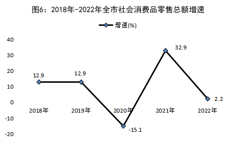 全年全市(全域口徑)社會消費品零售總額392.02億元,比上年增長2.2%。