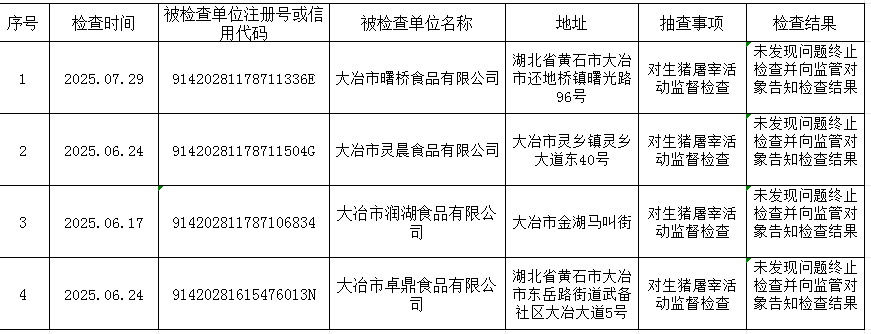 2025年二季度“雙隨機、一公開”生豬屠宰活動監督檢查結果公示表