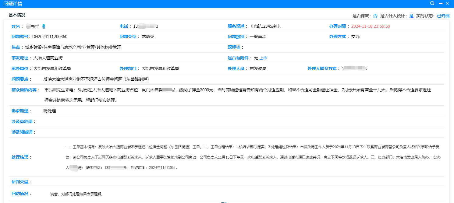 反映大冶大道商業街不予退還占位押金問題(東岳路街道)工單