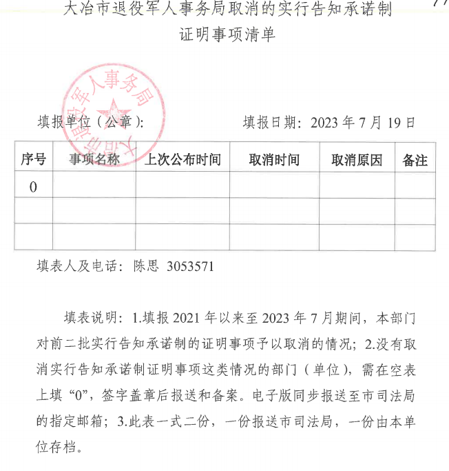 大冶市退役軍人事務局取消的實行告知承諾制證明事項清單(2023年)