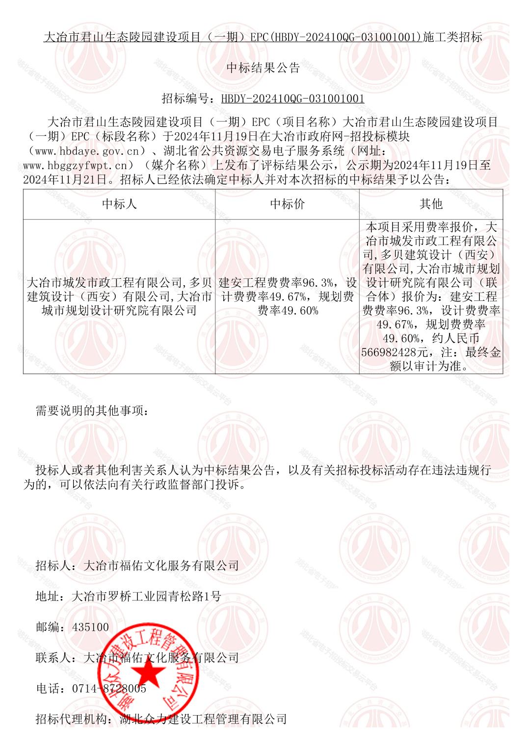 大冶市君山生態陵園建設項目(一期)EPC中標結果公告