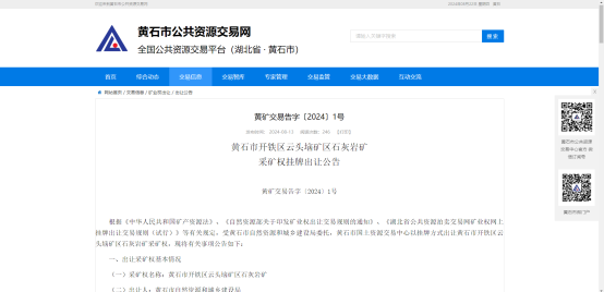 截至2024年8月大冶沒(méi)有礦業(yè)權(quán)出讓項(xiàng)目,目前黃石地區(qū)在黃石公共資源交易網(wǎng)礦業(yè)權(quán)出讓項(xiàng)目只有1宗(黃石市開(kāi)鐵區(qū)云頭垴礦區(qū)石灰?guī)r礦采礦權(quán)掛牌出讓公告)。具體情況見(jiàn)下列截圖。