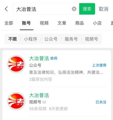 關(guān)注方法二:微信搜索“大冶普法”認準“大冶普法”,點擊關(guān)注。