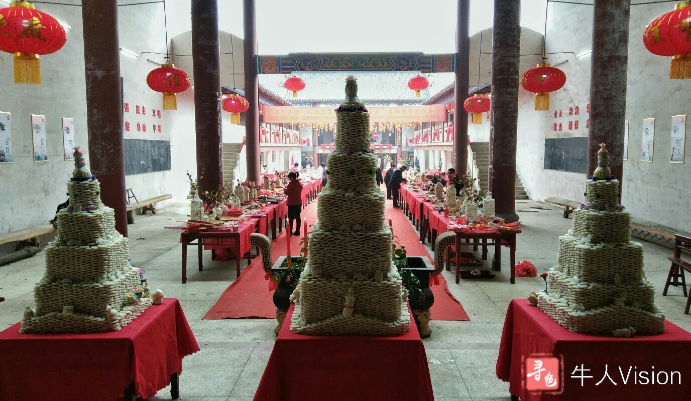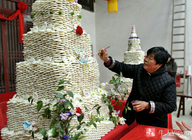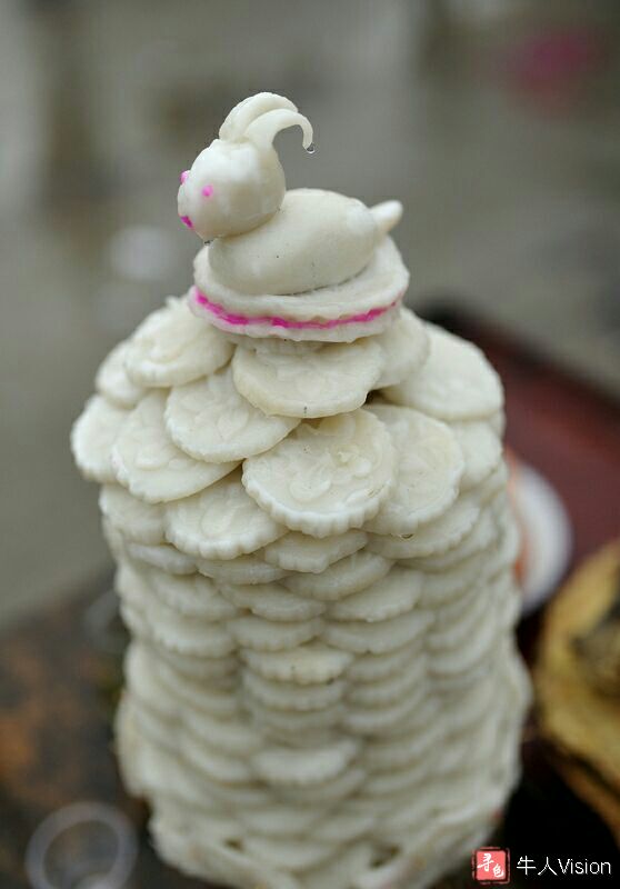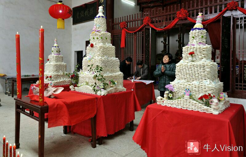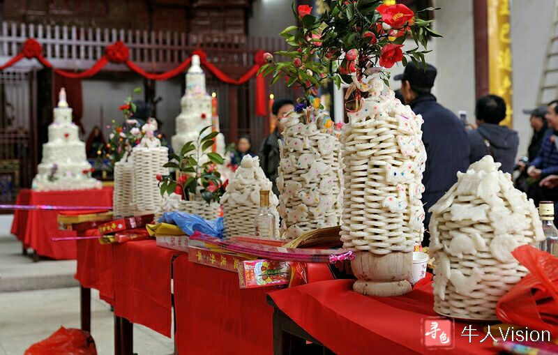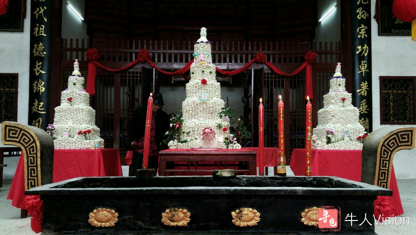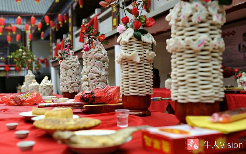 粑山堆成后,在接“土主老爺”時,用門板鋪成供臺,粑山堆在中央,各戶大小粑山一排排堆在供臺上,加上鹵雞、蛋餅等,來供奉土主老爺,又讓大家欣賞,就像是一次規模宏大的印子粑藝術展覽。如今,粑山選在祠堂里或在公堂外面,由村民抬出自家的“八仙桌”,將印子粑堆放在一排排“八仙桌”上,特別有趣的是,村民的巧手不僅能制作出精美的印子粑,還制作出許多裝飾物,如花卉、樹林,如果不仔細觀看,還認為是工廠里生產出來的塑料花卉,讓人流連忘返。故此,較之往年不同的是,評委還對印子粑進行藝術評比,評出了優秀的制作能手。