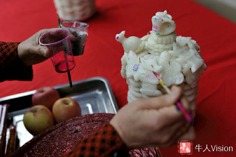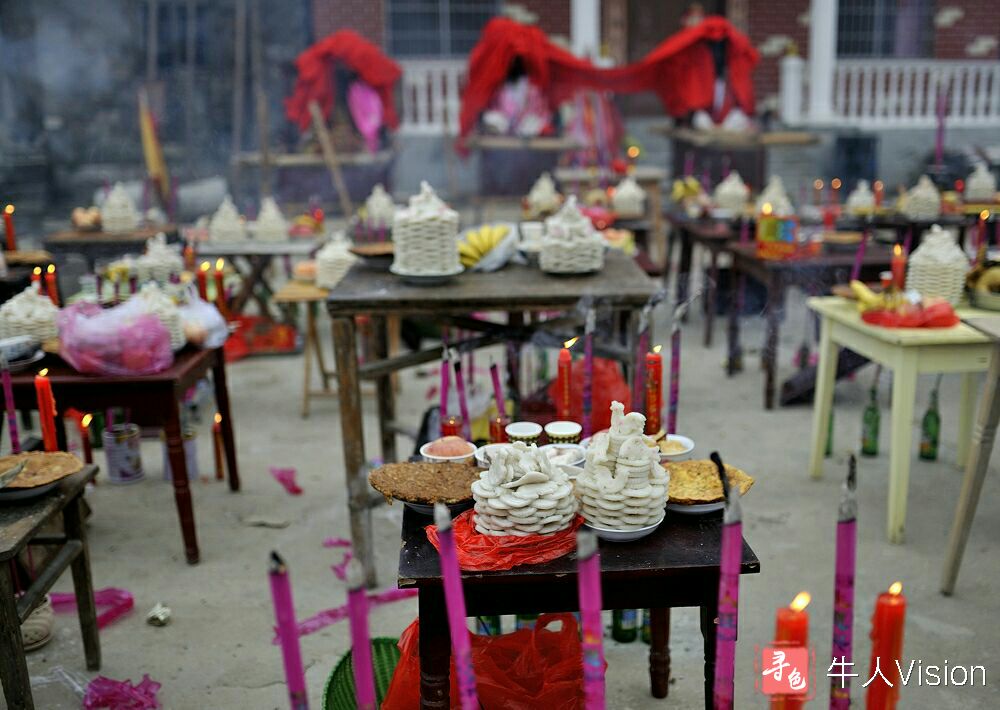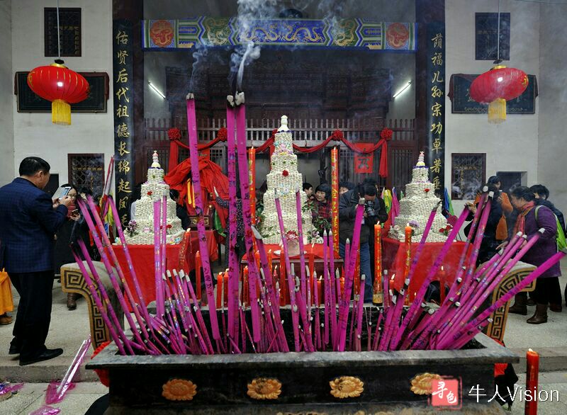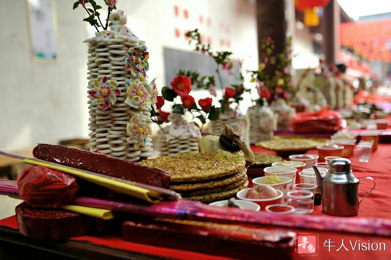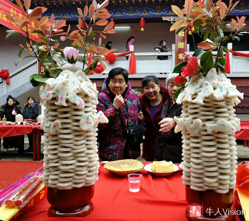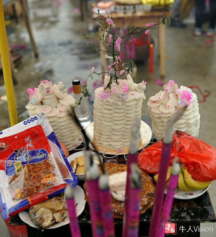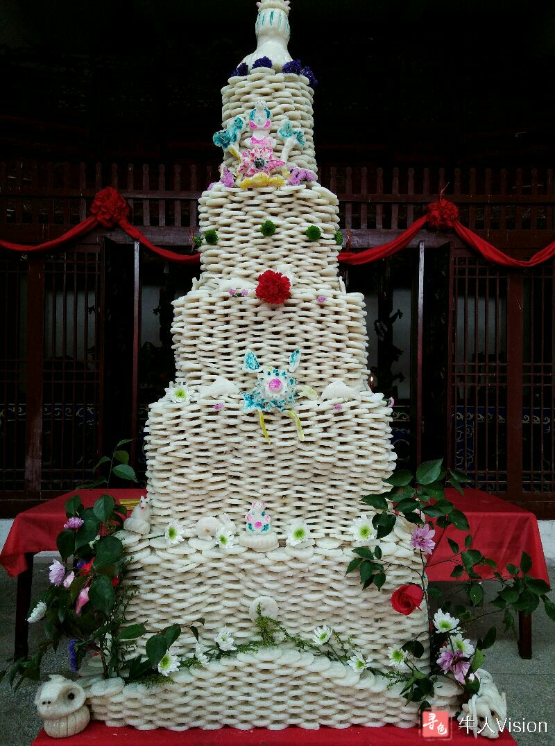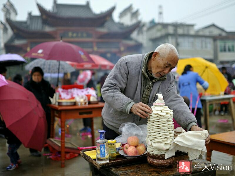 粑山堆成后,在接“土主老爺”時,用門板鋪成供臺,粑山堆在中央,各戶大小粑山一排排堆在供臺上,加上鹵雞、蛋餅等,來供奉土主老爺,又讓大家欣賞,就像是一次規模宏大的印子粑藝術展覽。如今,粑山選在祠堂里或在公堂外面,由村民抬出自家的“八仙桌”,將印子粑堆放在一排排“八仙桌”上,特別有趣的是,村民的巧手不僅能制作出精美的印子粑,還制作出許多裝飾物,如花卉、樹林,如果不仔細觀看,還認為是工廠里生產出來的塑料花卉,讓人流連忘返。故此,較之往年不同的是,評委還對印子粑進行藝術評比,評出了優秀的制作能手。