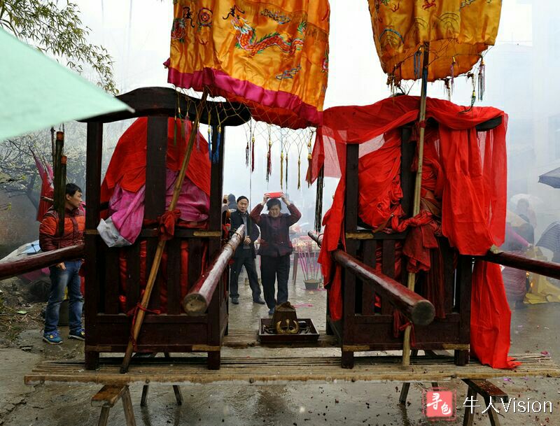到了晚上,土主老爺在哪個村子,晚飯后,該村的男女老少都聚集在正堂,觀看“架菩薩”?!凹芷兴_”,先用兩根長杠子夾綁住土主菩薩,杠子兩端用粗繩索系好,繩子中間各綁一根短杠子,然后由四位身強體壯的漢子,前后各兩人面對面地抬著,向左、向右各橫走兩步半,兩手同時扳動兩根大杠子翻動菩薩達108度左右。旁邊站有人,手提大銅鑼,使勁敲打,節奏愈打愈快,菩薩翻得越來越快,大家齊呼:“哦火”!場面極為壯觀和熱烈,圍觀者開懷大笑。故此,“架菩薩”,是游藝民俗的反映,也是原始的民間舞蹈,是村民們喜聞樂見的娛樂藝術和鍛煉身體的活動之一。據說,“架菩薩”并非一件易事,是要有功底的,幾個翻滾下來,早已是汗流浹背,所以,不僅娛樂功能很強,也能鍛煉人們體質,發揚尚武精神,啟迪人們智慧,豐富人們精神生活,這項有益的游藝項目,深得村民的喜愛,從而使它千年流傳,經久不衰。